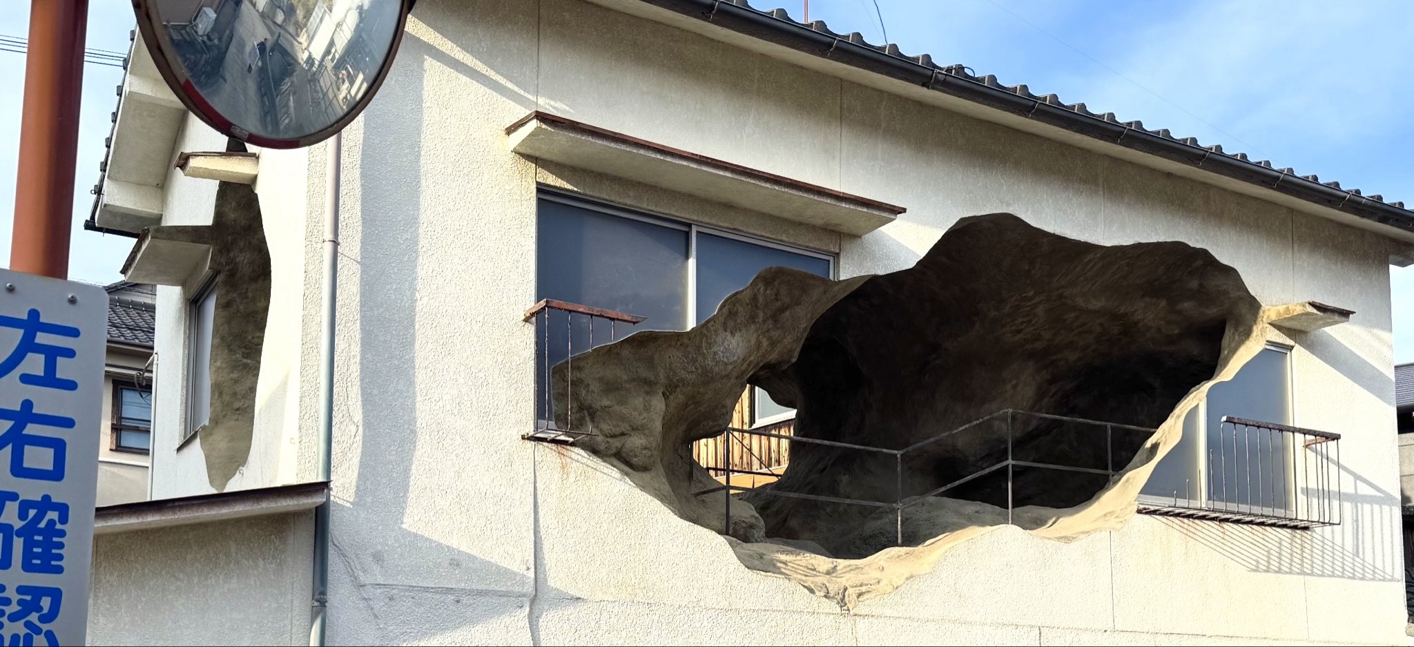 Along a narrow residential street in Kanawa, the historic heart of Beppu City known for their geothermal hot springs, is an inconspicuous 2-story home that, until recently, would have been barely noticeable. With gaping holes carved into it, the home was recently revealed as art collective Mé’s newest installation.