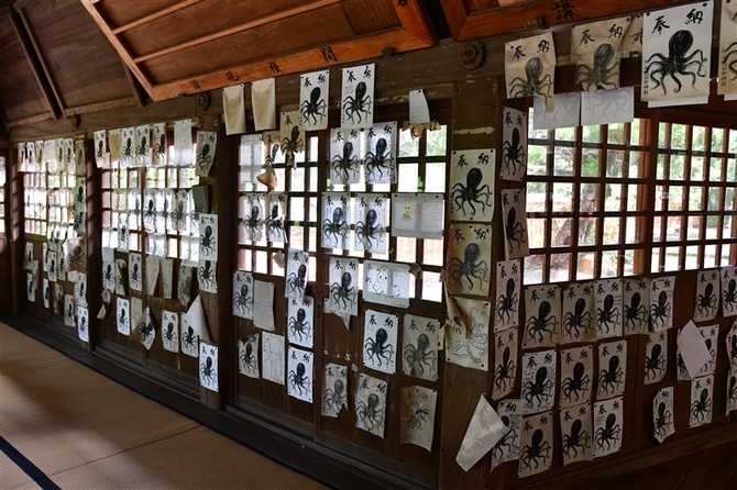 A popular ceremony involves donating a drawing of an octopus and praying for safety. During the period, worshippers must abstain from eating octopus in order for the prayer to work. For this reason, the main hall is also decorated with drawings of octopuses from past ceremonies, creating a surreal sight.