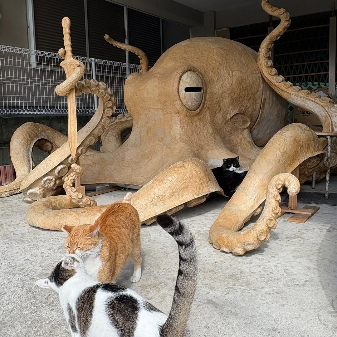 Hayasuhime Shrine in Oita prefecture is a rarity in Japan because it is dedicated to the octopus. When local sculptor Kousei Hashimoto was tasked with creating a new deity to be enshrined, he expected for it to be completed by the end of the year. But the neighborhood cats had different plans.