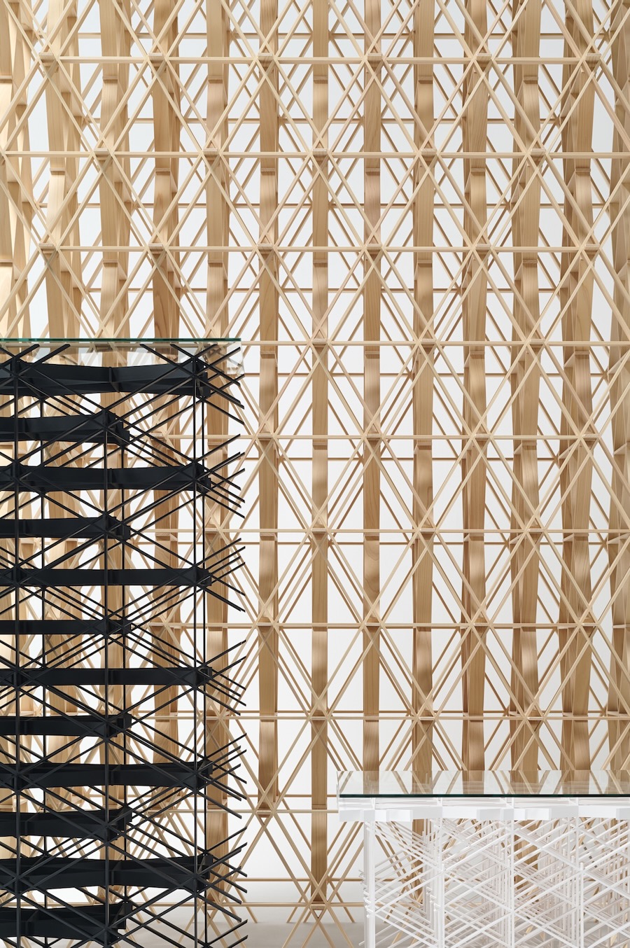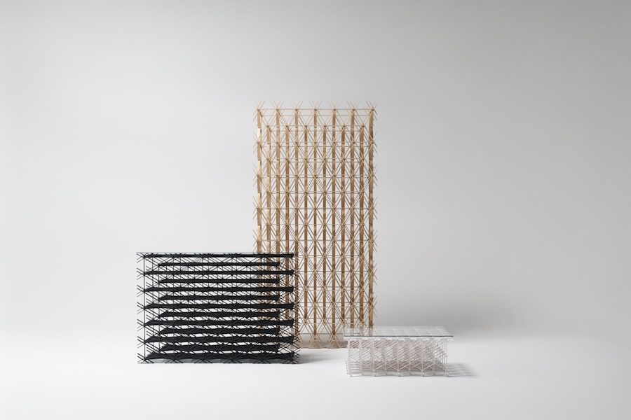 Architect Koichiro Oniki presented Forêt, a series of furniture made exclusively from kumiko. French for forest, Forêt is made using the traditional Japanese technique for assembling pieces of wood into geometric patterns without using nails. The lattice-like structured tables and space divider were equally beautiful and stable, offering a new perspective on the potential for the equilateral triangle: a basic pattern in kumiko that gives it its stability. The beautifully textured cypress wood, arranged in succession, evokes the sense of depth of a “forest.”