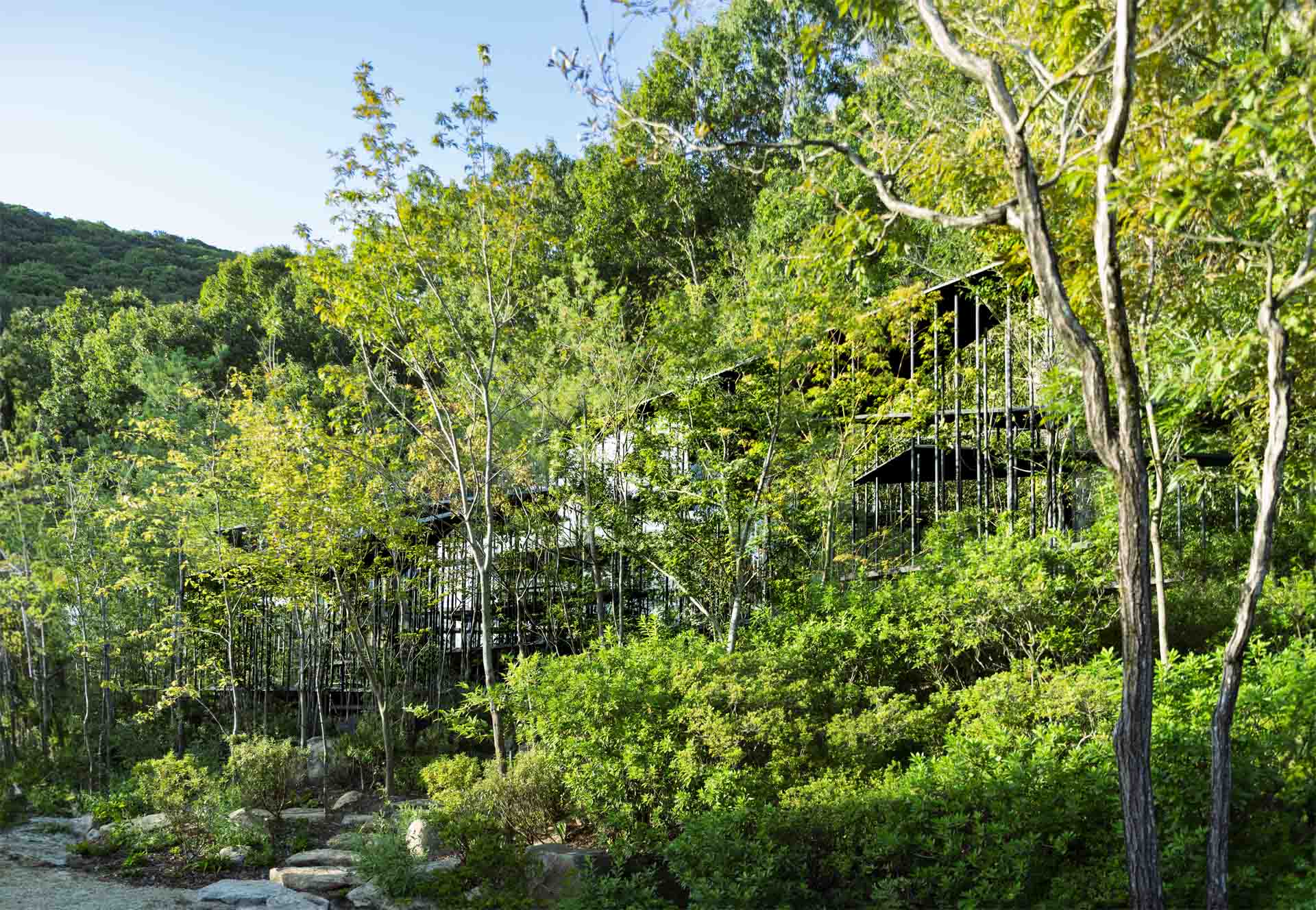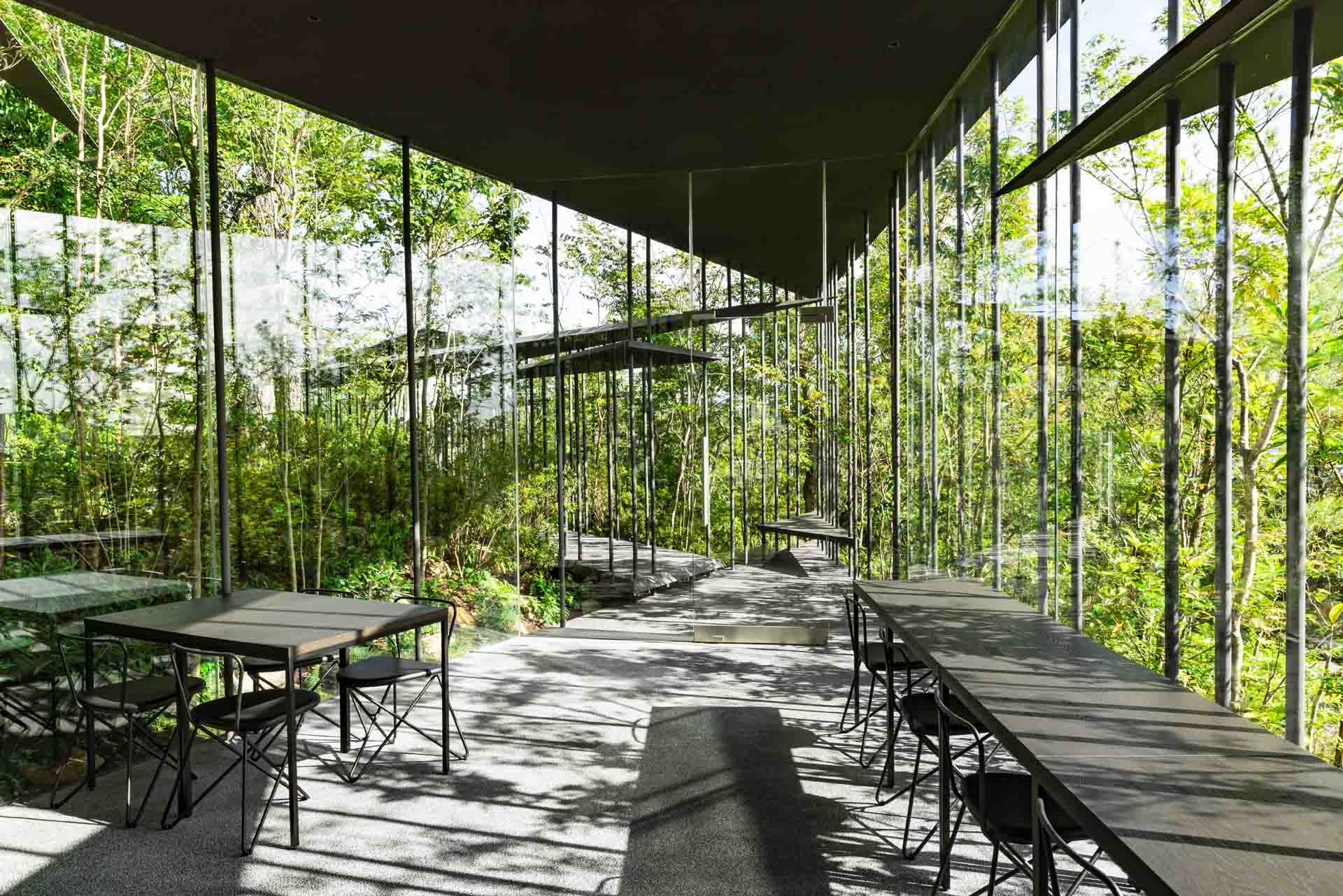 F Gallery was designed by Makoto Takei and Chie Nabeshima of architecture firm TNA and is made up of multi-tiered triangular spaces that extend into the trees. Despite its significant footprint, the space feels astonishingly airy and organic thanks to the ultra-thin steel beams that mimic the surrounding trees while supporting the structure itself.