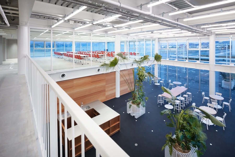 The new factory, which opened in January of this year in the company’s birth town of Ota City, Gunma, consolidates various functions that had been spread out around Japan. But doing so required a balancing act of various specs and requirements that differed throughout the space from parking lot, factory and wet areas to cafeteria, conference and training rooms, with each requiring its own lighting, furniture and signage.