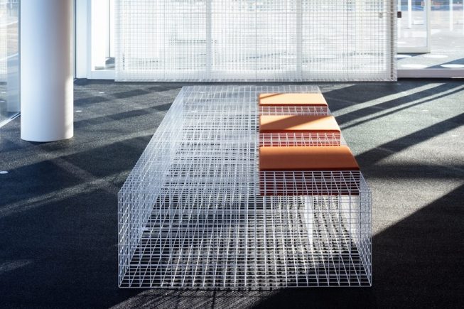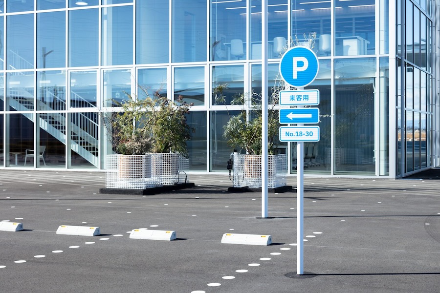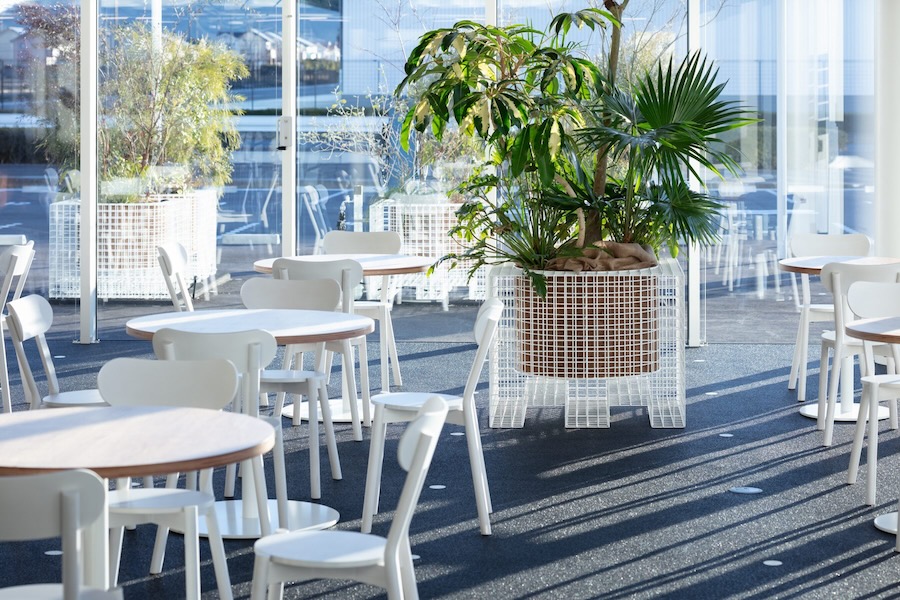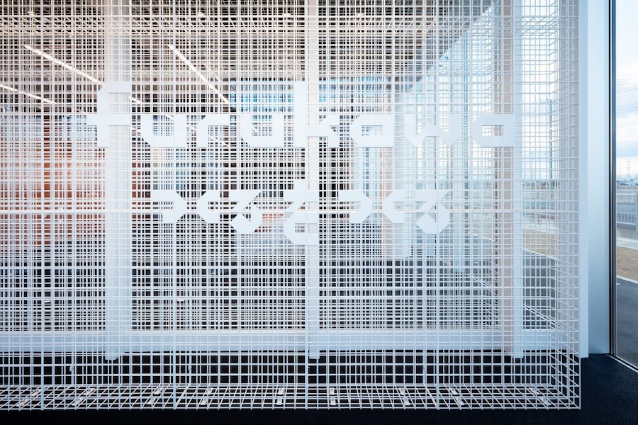 Schemata Architects (previously) teamed up with the Irobe Design Institute, who created a signage plan that echoes the grid-like architectural elements of the space through dots that begin in the parking lot and extend throughout the building. And rather than build a fence or wall around the site, the parking lot features elements and signage that matched ordinary roads, creating a sense of homogeneity and connectedness.