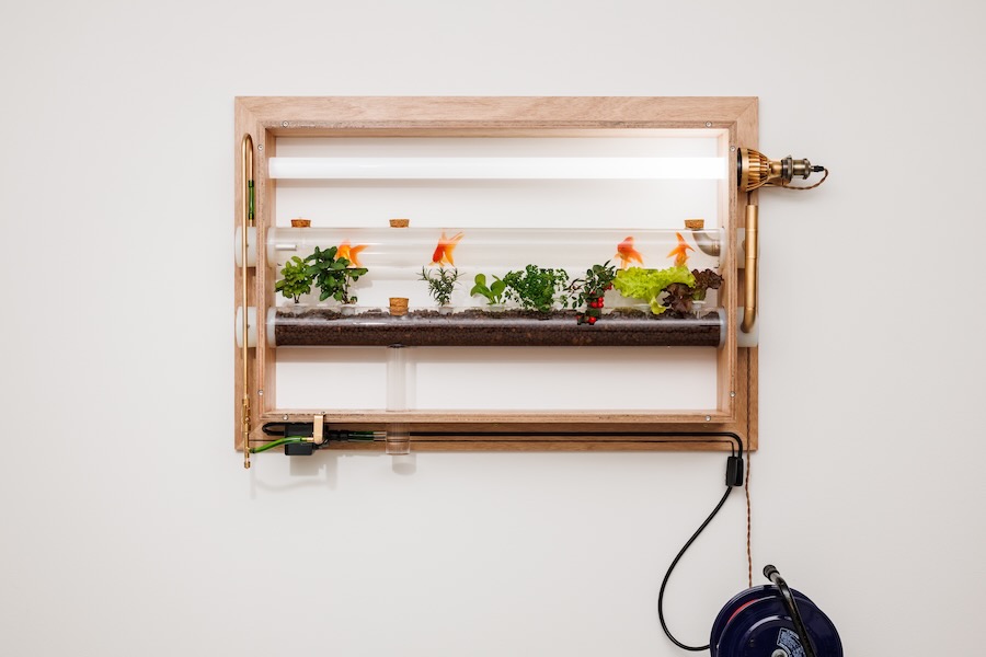 Gaku-poni, a combination of the Japanese word for frame (gaku) and aquaponics, was conceived as a piece of furniture that merges two ecosystems. A goldfish aquarium sits on top, shaped as a shallow, horizontally elongated cylinder that takes into account the fish’s preference for horizontal movement.
