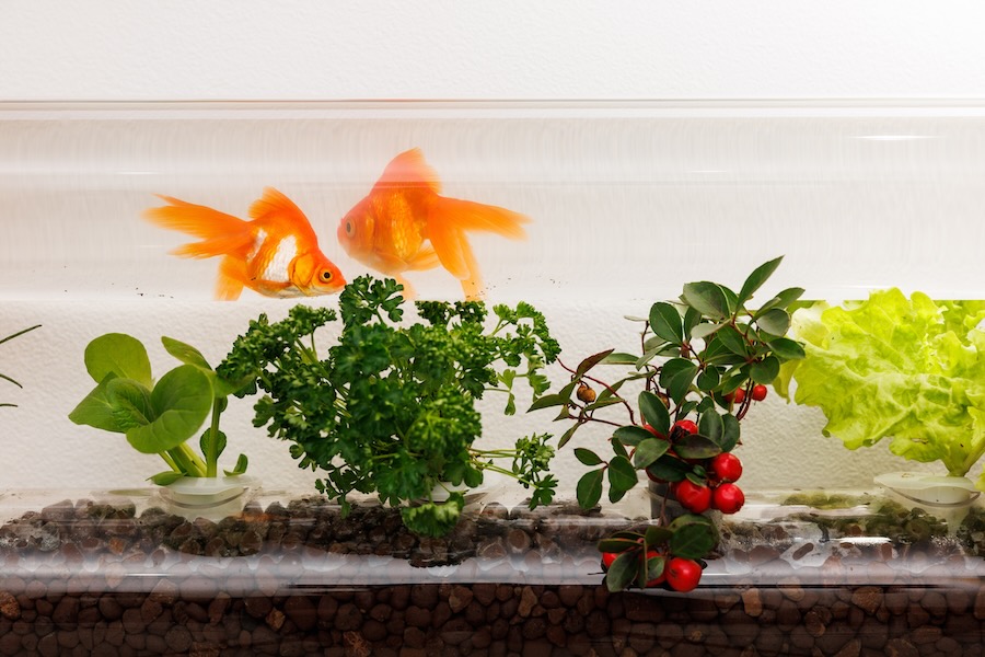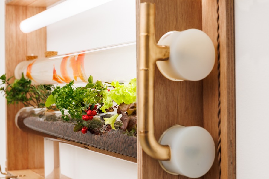 Below is a plant bed filled with hydro-balls that host microorganisms. The two are connected, both physically and symbiotically, as fish waste flows from the aquarium into the plants, which uptake the nutrients and then return purified water to the aquarium in a self-sustaining loop. A gallery-style spotlight above supports visibility and photosynthesis.