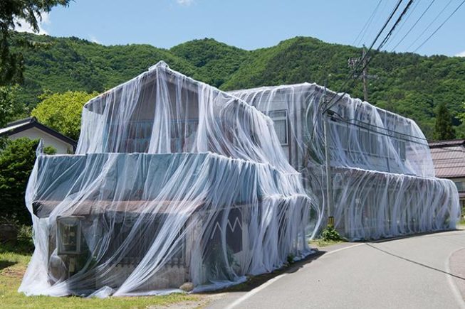 The festival has previously given birth to works by Caitlind r.c. Brown & Wayne Garrett, who covered vacant houses and shops with a thin veil during the 2017 art festival, world-renowned origami artist Tomoko Fuse, Swiss artist Felice Varini, who paints on architectural structures, and the art collective Mé, who designed a space on top of Takagariyama to view the landscape of Shinano Omachi (below, clockwise from top-left).