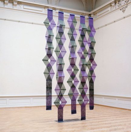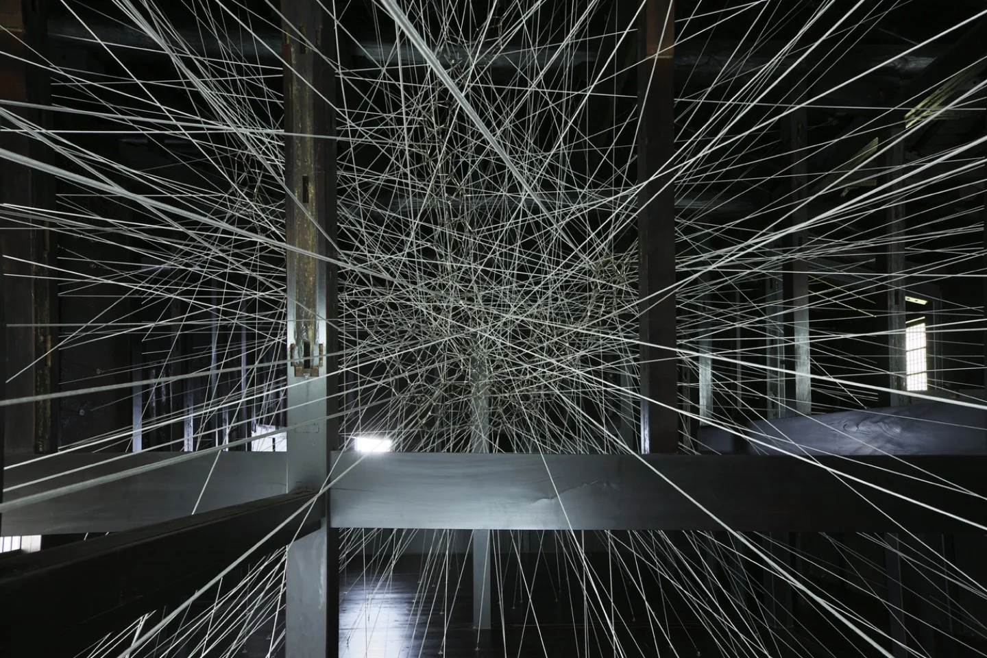 With its walls removed, the structure of a house is laid bare. The sculptor Antony Gormley has installed 682 cords that cut through the pillars and beams of the space from walls, floor and ceiling, and condense around the volume of the artist’s body in a central polyhedral matrix.