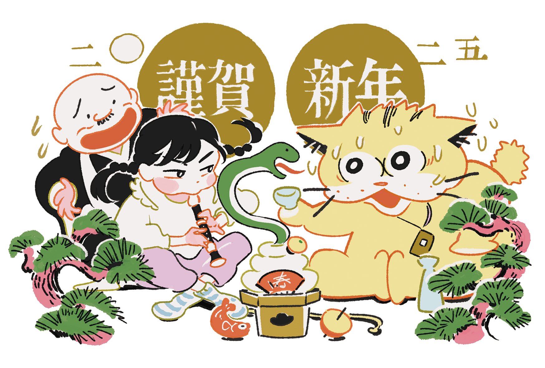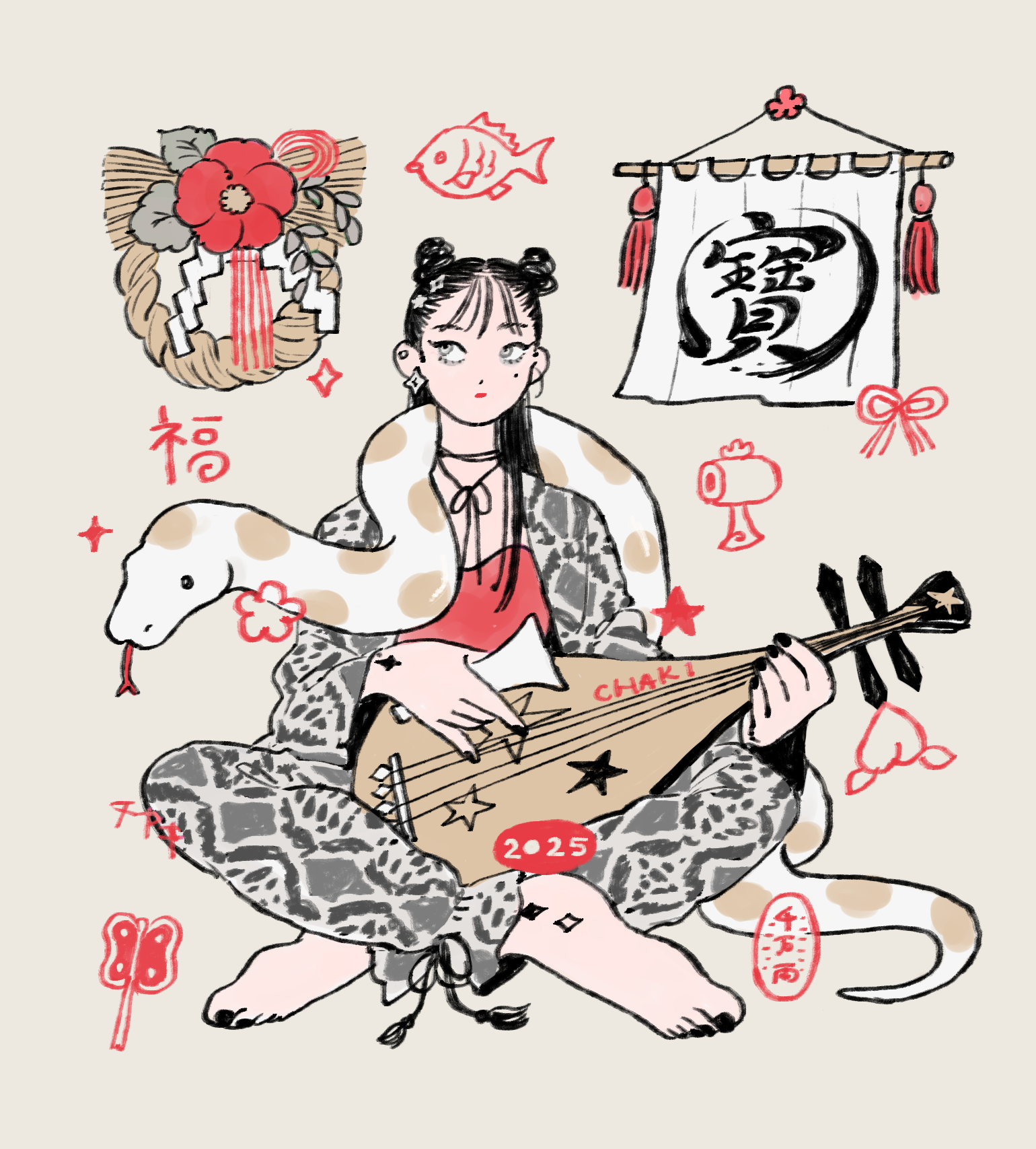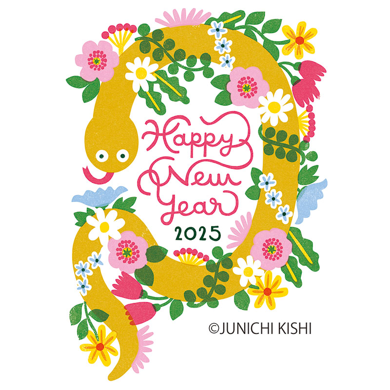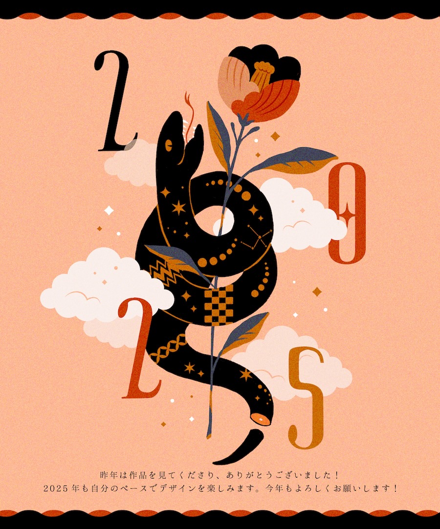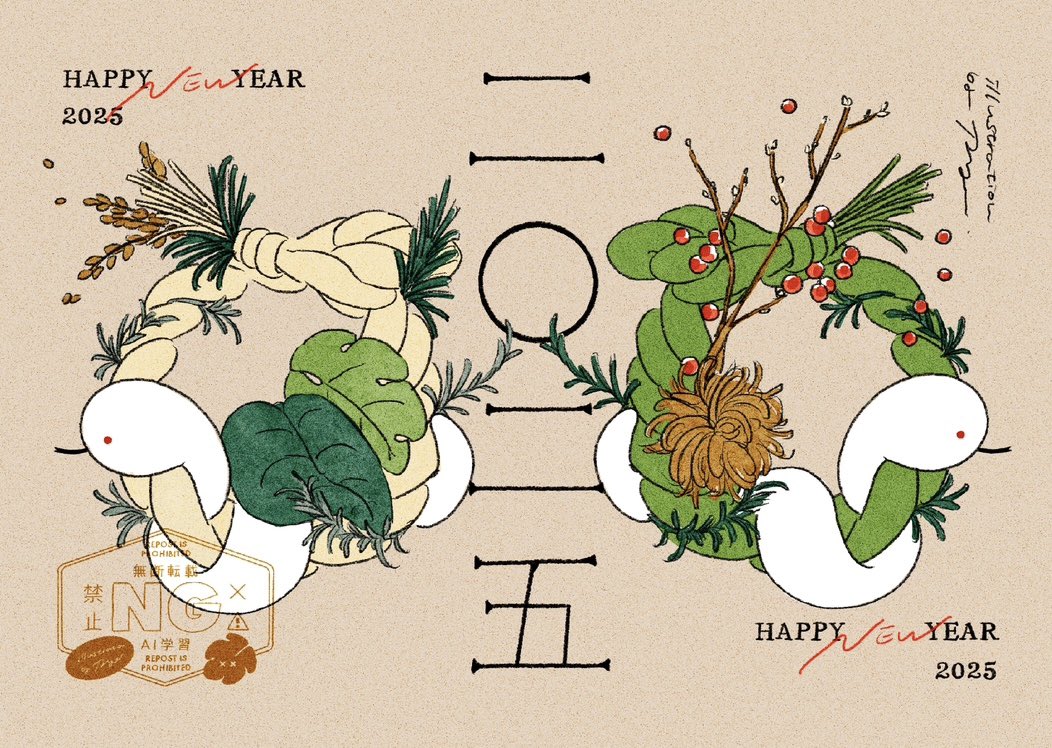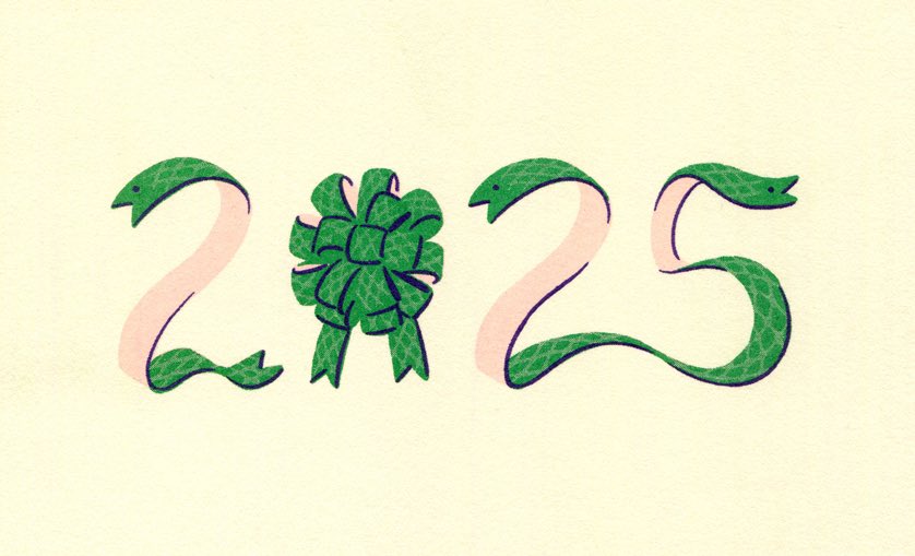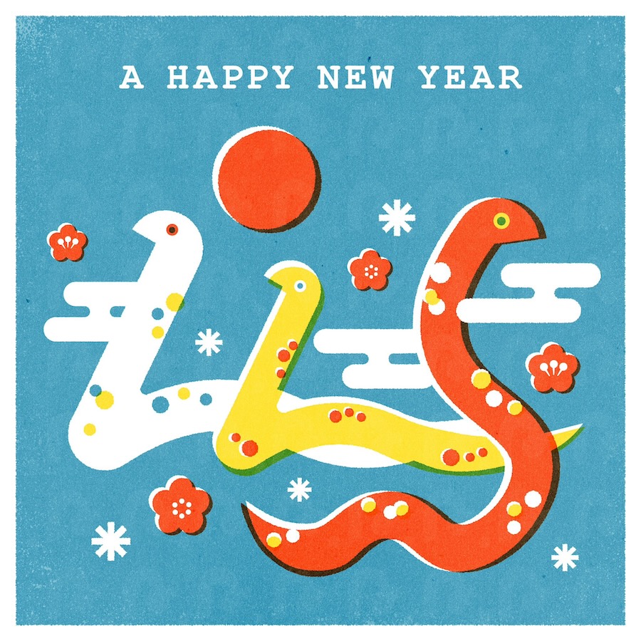 Happy New Year of the snake! In Japanese art and mythology, the snake is a complex figure that represents both auspiciousness and malevolence. Snakes are revered as sacred beings, embodying themes of renewal, fertility, and the duality of nature as both protector and destroyer. And as tradition goes, we’ve put together our favorite nengajo, or New Years cards, from Japanese artists and designers featuring this year’s zodiac animal in all its colorful forms. We present to you, in no particular order, some inspiring artwork in hopes that 2025 will be full of surprises.