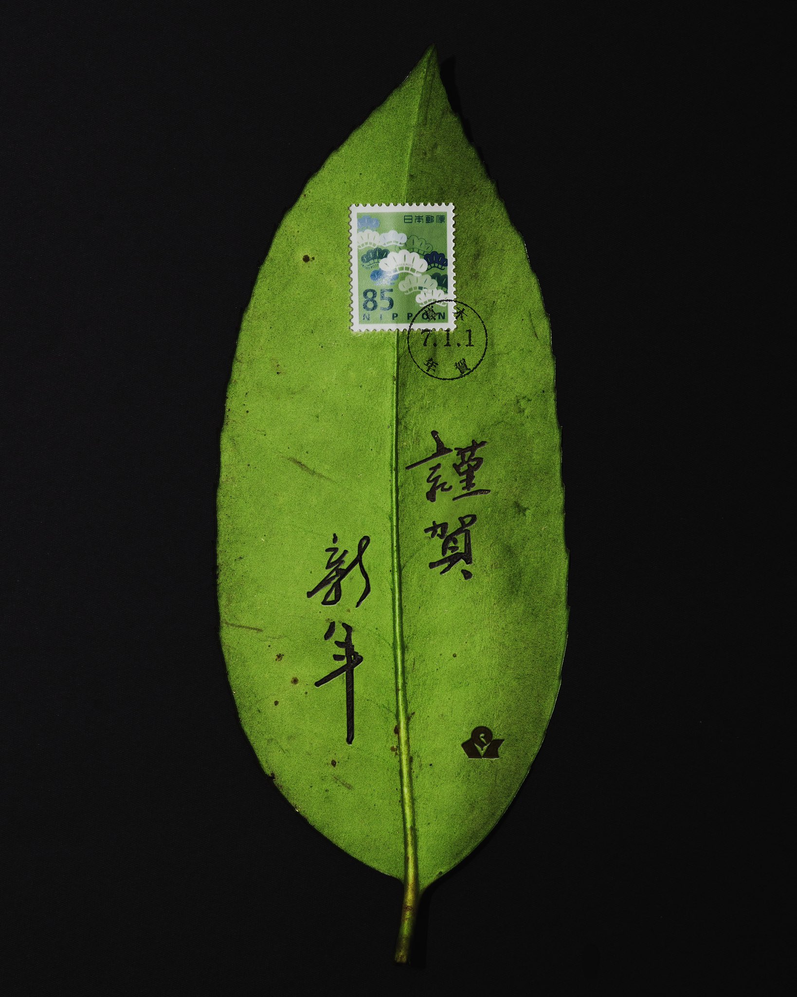 Tomoka Furuya, who researches the potential of Japanese native plants to develop new food products, created a new years card from lusterleaf holly. She explains that this leaf was the origin of hagaki (postcard, in Japanese) which literally means “leaf writing.” When the underside of the leaf is scratched with a sharp object, the scratched part turns black.