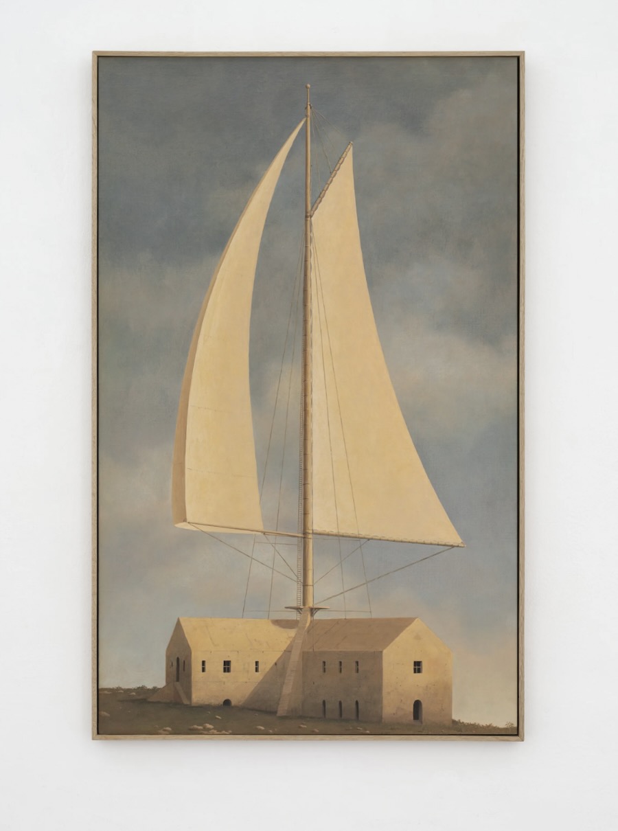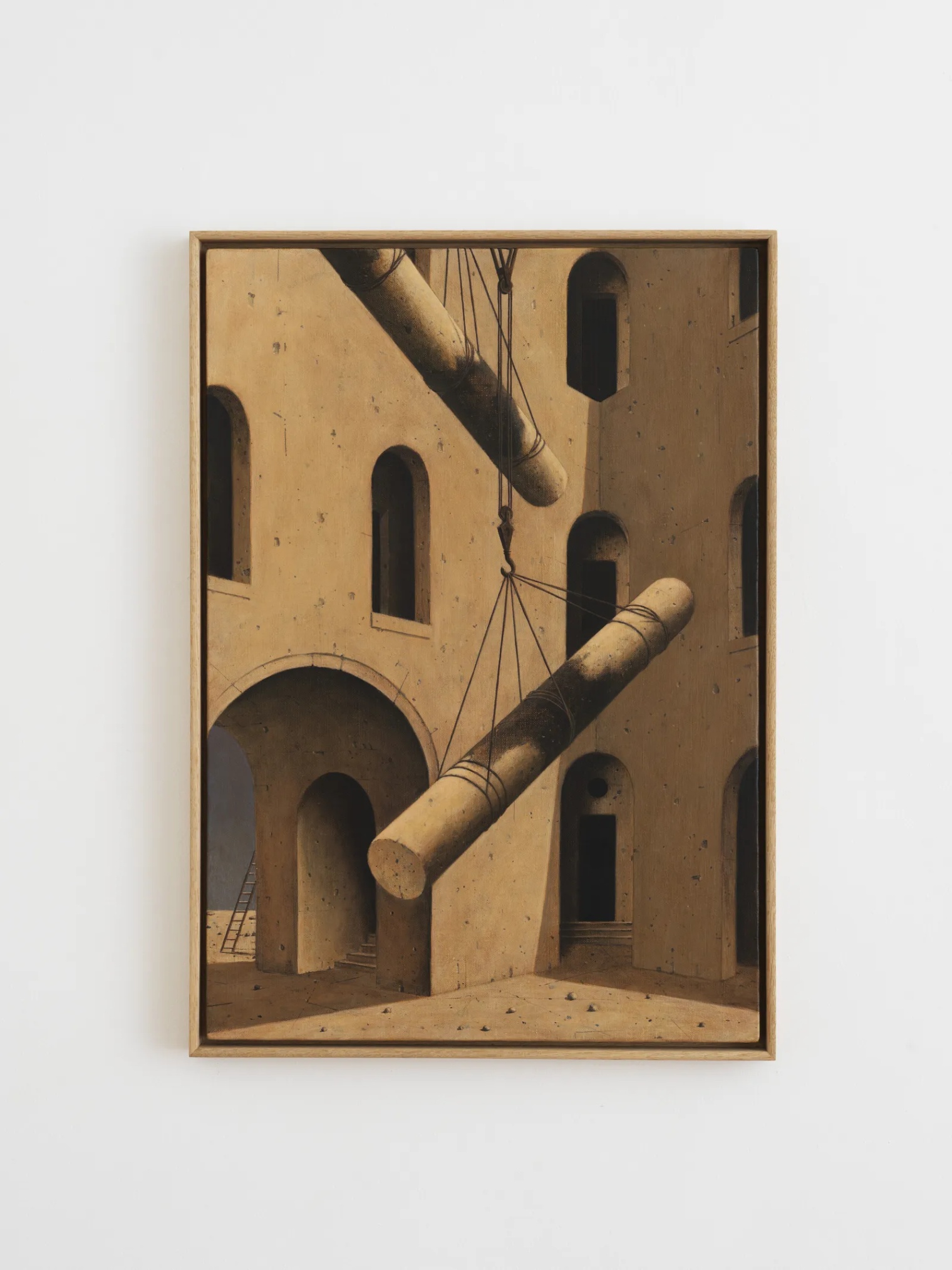 Nomata’s style is influenced by various artistic references, including Magritte, de Chirico, Henri Rousseau, and Charles Sheeler. His early work employs a predominantly neutral palette with abrupt changes in scale and neo-classical motifs. The visual language involves structural elements like beams, tarpaulins, netting, and scaffolding, drawing upon his upbringing in an industrial area of Tokyo.