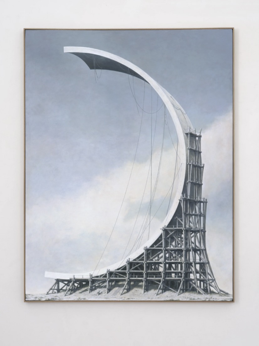 Nomata’s structures become increasingly fragile, pointing to human vulnerability. Nomata’s recent paintings exhibit reduced material volume, greater height, and verdant canopies. Scaffolding wraps protect these structures, emphasizing human vulnerability and Windmills address the growing crisis of climate change.