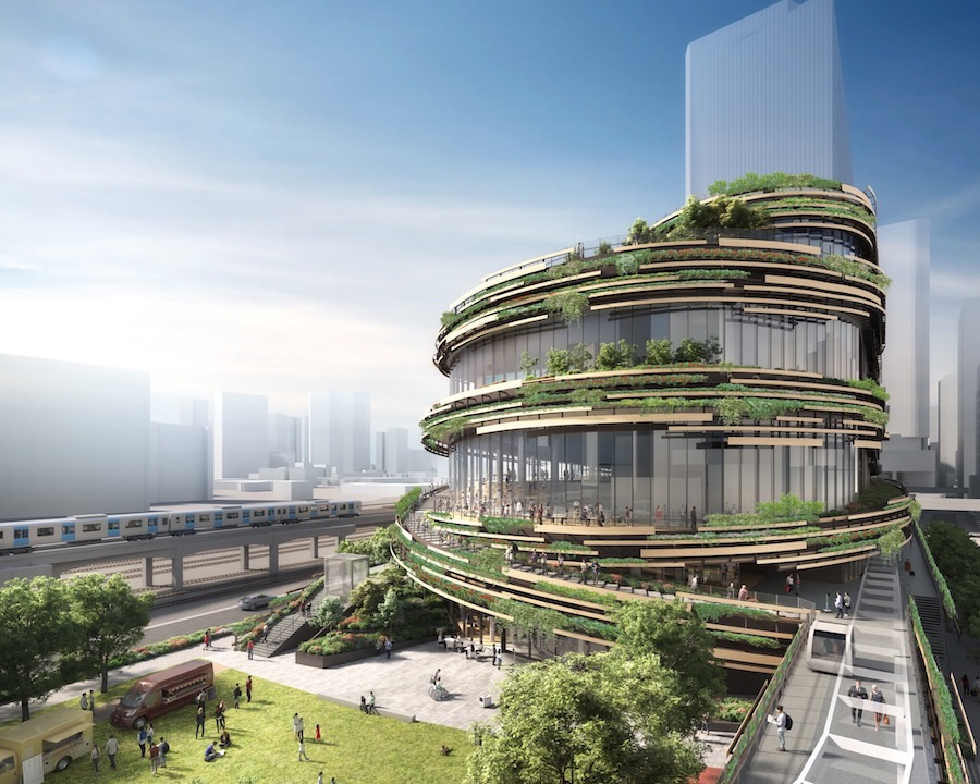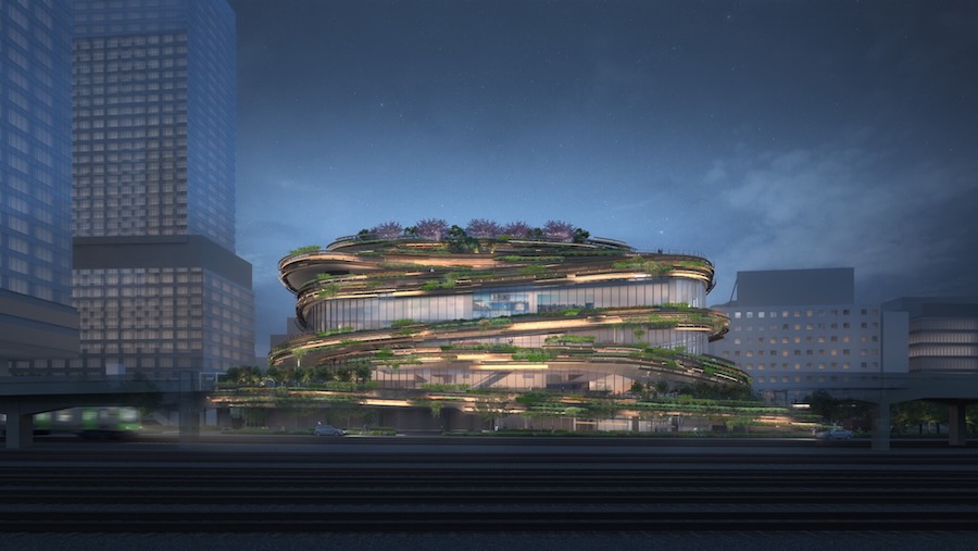 Mon is a new experimental museum opening next to Takanawa Gateway Station, and is the final crown of the district’s redevelopment. The exterior was designed by Kengo Kuma and features wood and greenery rising in a spiral pattern connecting earth and sky. “This pattern creates a three-dimensional corridor where flowers bloom in each season and creates an opportunity to experience the seasonal change and character.” The exterior links to the museum’s programming, which will feature seasonal rotations that blend art, science, technology, entertainment, Japan’s seasons, and traditional culture.