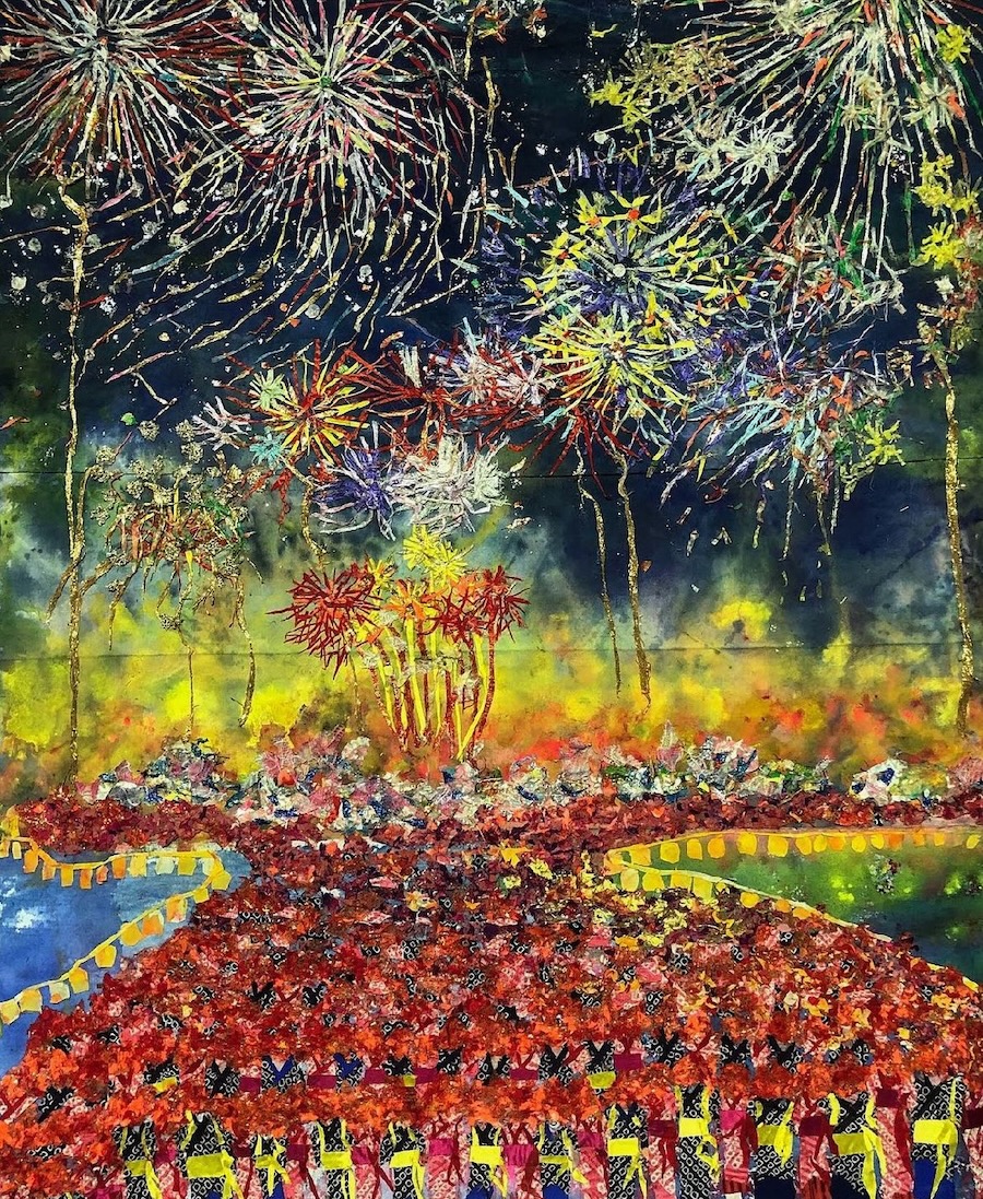One day, Sugiyama found a pack of discarded colored markers near a dumpster. Noticing that they were still in good shape, she decided to take them home and begin doodling. Soon, images of trees and rivers all inspired by the nature of Aomori began pouring out of her and onto the pages of a sketchbook. After a year or so of sketching with the markers, Sugiyama remembered her mother’s colorful kimonos that had been stored away. There was no use for them in storage so the artist, whose creative juices were now flowing, decided to begin incorporating them into her work, which eventually led to a style she has coined as “Kimono Reborn Art.”