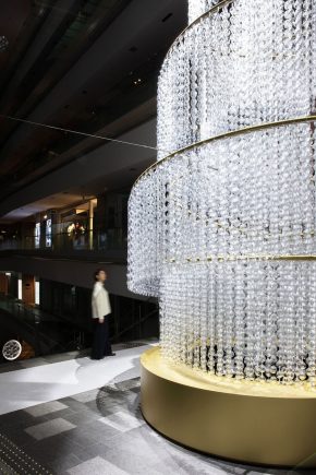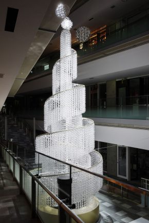 “Christmas Tree of Light” is a spiral-shaped luminescent tree standing 28 ft high (8.4m) and made from 40,000 fresnel lenses. It was designed by architect Yuji Okitsu, who explained that he was inspired by one of the most distinctive features of the Omotesando Hills building, designed by Tadao Ando: a spiral ramp surrounding the expansive atrium. The double structure of spirals and rings was created to express the cross-cultural exchange centered on Omotesando.