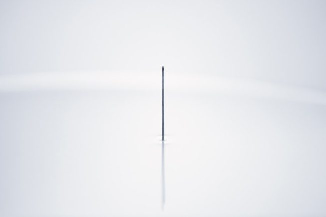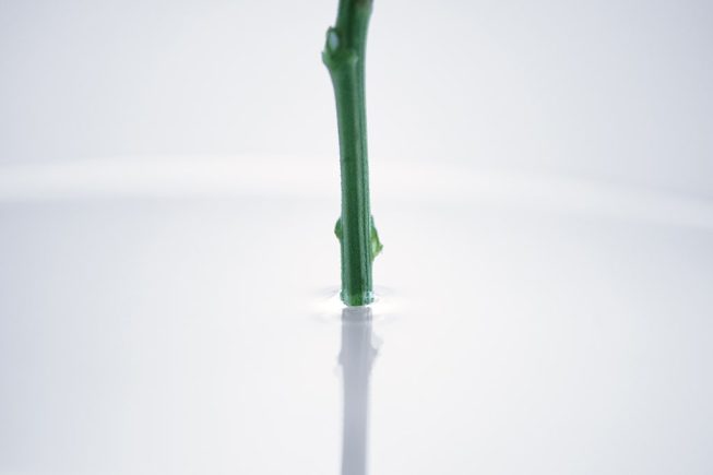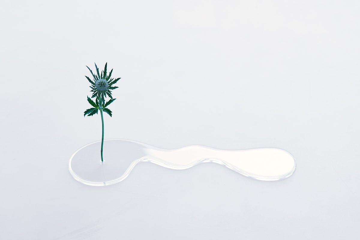 Created by Japanese design duo YOY (Naoki Ono and Yuki Yamamoto), Puddle was created as a prototype in 2022. The flat, translucent vessels are each organically shaped the way a puddle of water might spread out over a surface. The water is contained within a ledge just 1.5 mm high. The design is completed by a single plant stem being inserted over the tiny needle in the middle.