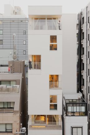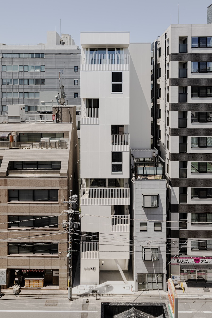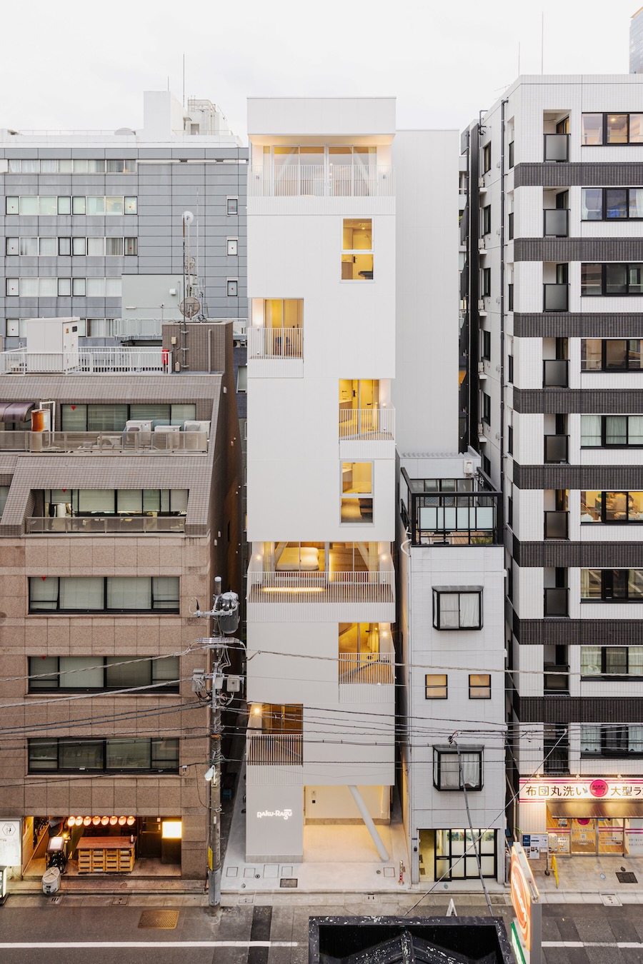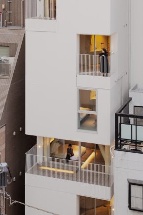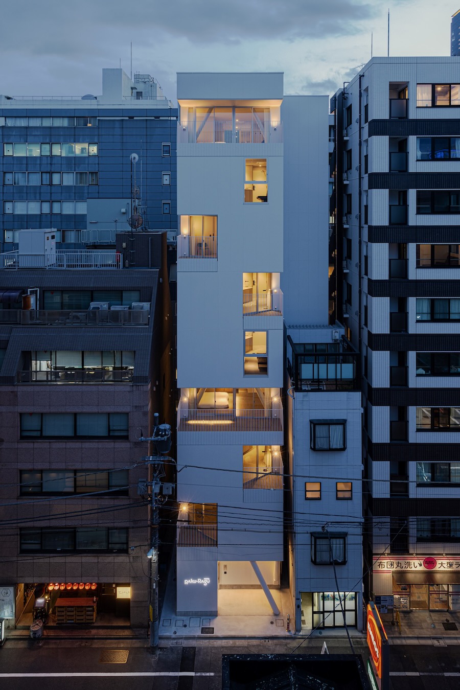 This 9-story Rakuragu hotel rises from an ultra-narrow site in the Nihonbashi district of Tokyo. If it’s nightlife you’re in search of, this hotel may not be right for you but if you’re looking for understated stylishness and rare outdoor space, this is a gem of a hotel. With just 14 rooms, its design prioritizes outdoor space through the arrangement of balconies that face different directions, capitalizing on the gaps between the neighboring buildings.