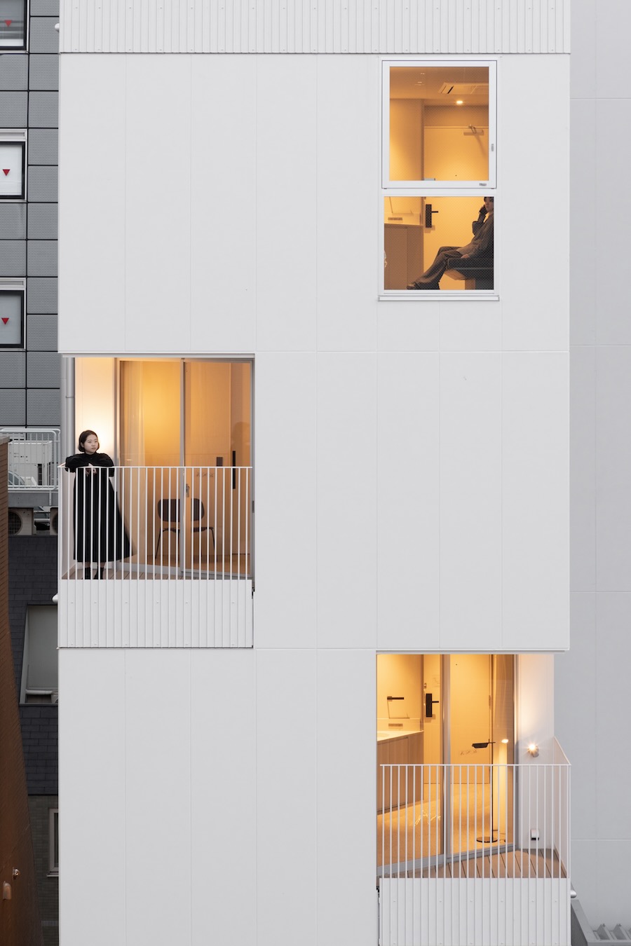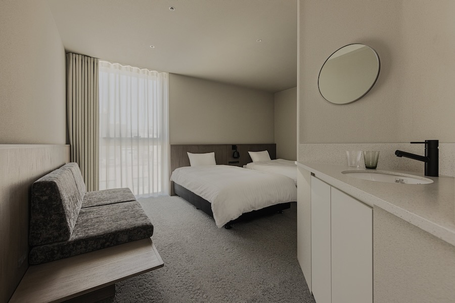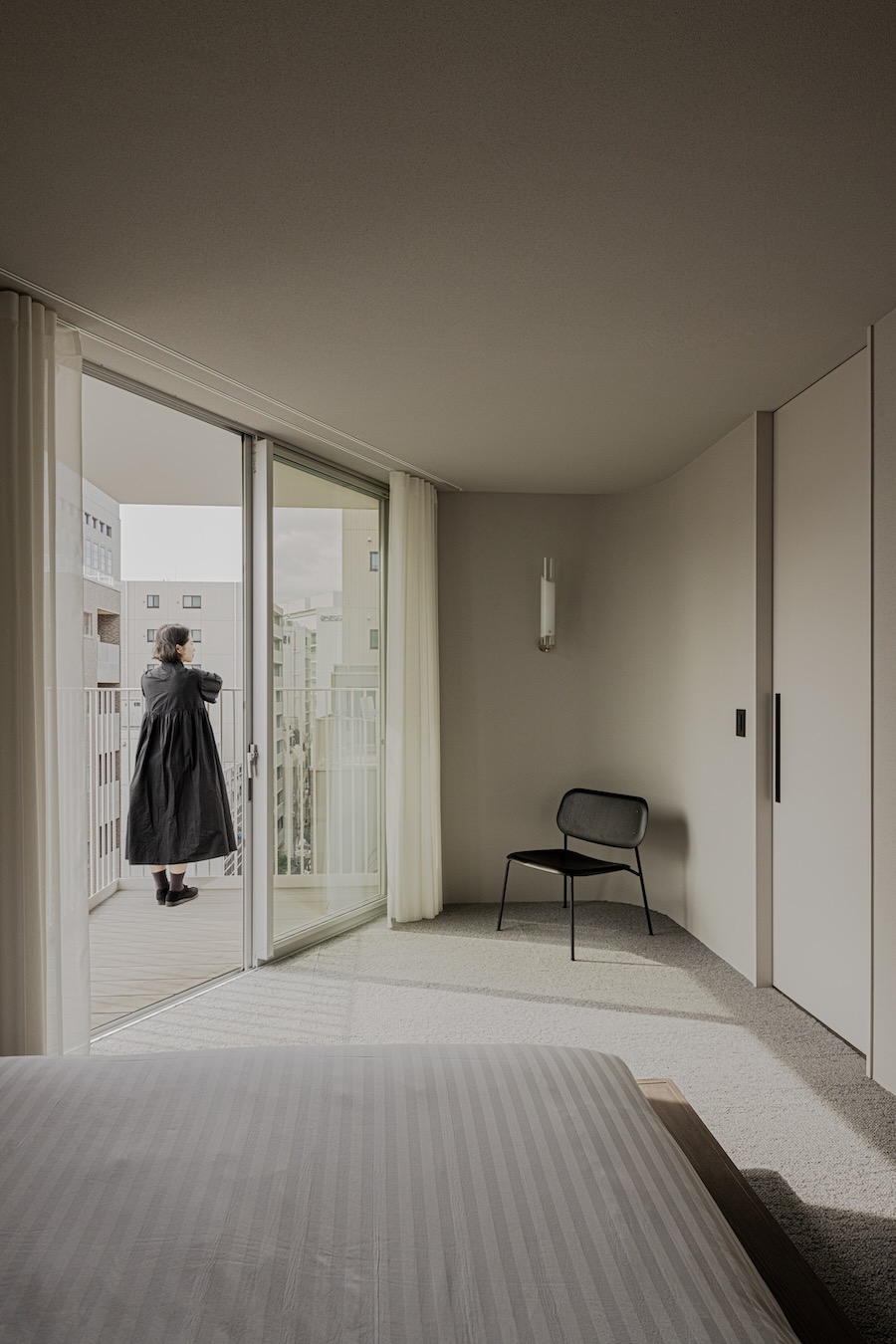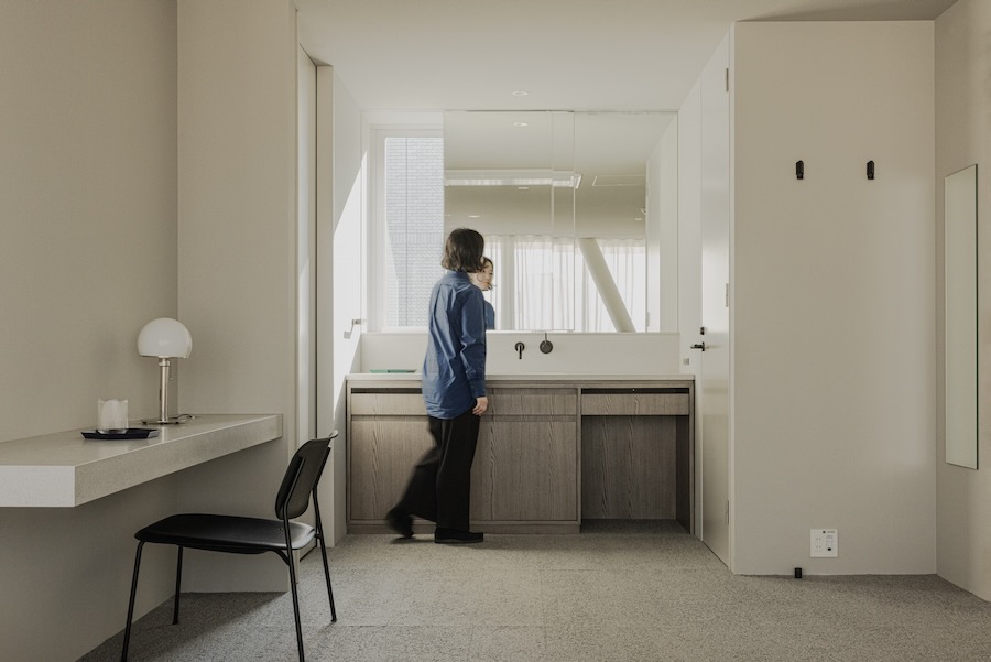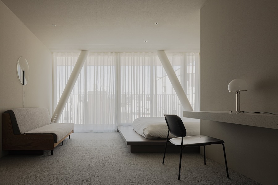 Speaking about the rooms, “we have tried to create a layout and select materials that allow guests to fall asleep comfortably and wake up in the morning sun,” say the architects. Bathrooms also occupy a relatively large surface in each room. This layout, combined with the balconies, offer more space than what you would typically find in a Tokyo hotel room.