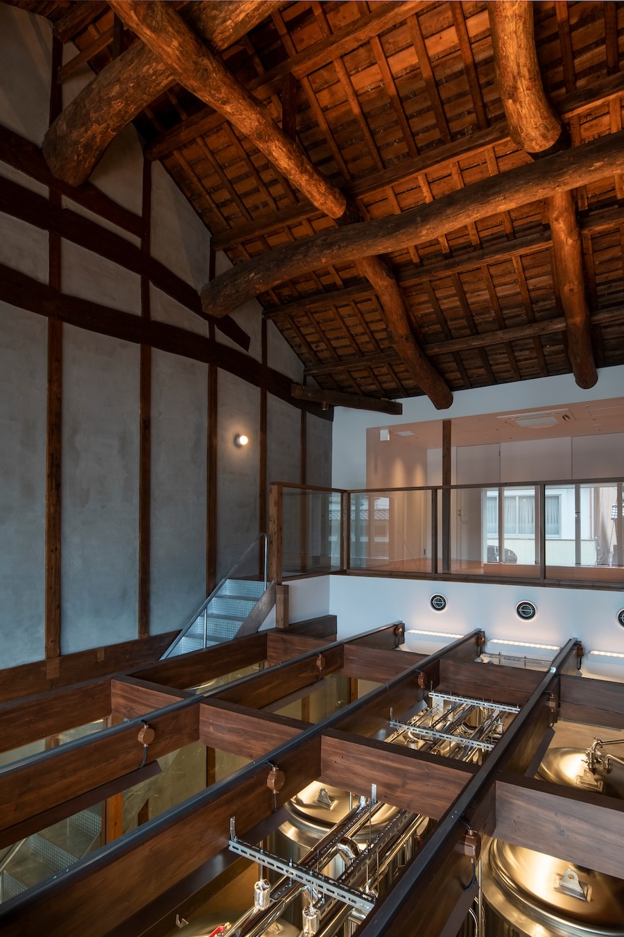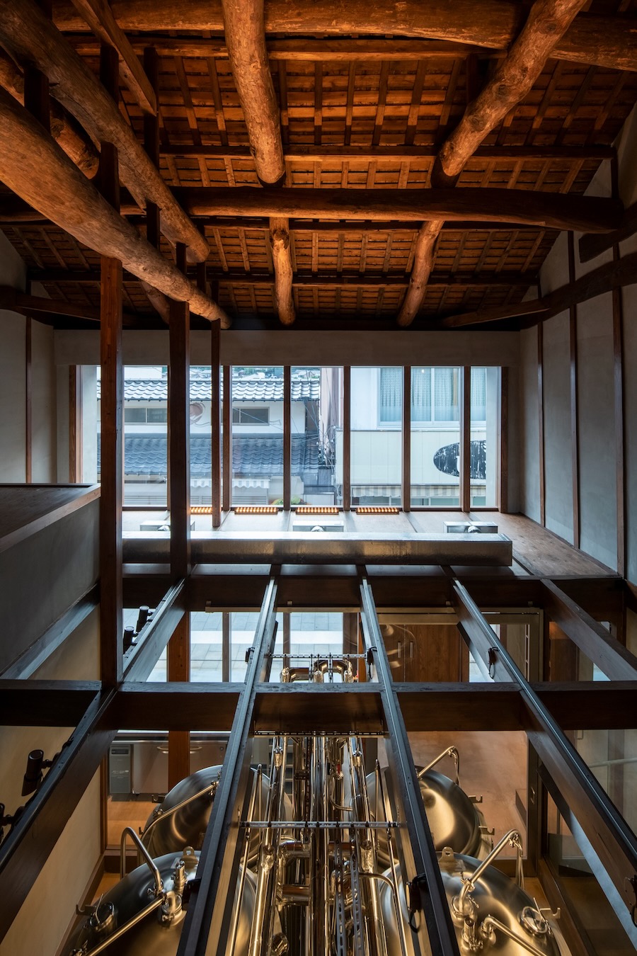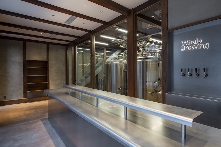 Whale Brewery is located inside a renovated 80-year old townhouse that’s located along Yobuko Asaichi-dori, which is known for their “wet market” where fisherman set up stalls to sell squid and other fresh delicacies. “We decided to not only perform necessary architectural renovations but also incorporate the strong characteristics this building possesses into the new brewery,” says architect Koichi Futatsumata, who preserved the gorgeous ceiling and skeleton of the building while making repairs and reinforcements to the facade and roof. “The facade, including the atrium section, is glass, allowing the interior to have a ceiling while still showcasing the impressive wooden framework towards the street.”